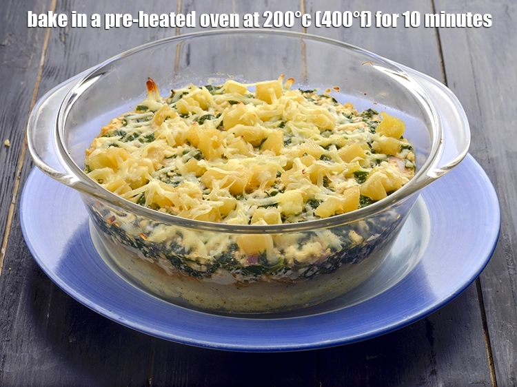 The middle layer is a lively mix of blanched spinach and crumbled paneer, blended with onions, red chilli sauce, and tomato ketchup. This combination creates a spicy-tangy filling that perfectly complements the mild potatoes underneath. The spinach and paneer add color, protein, and richness, while the sauces provide a zesty, peppy twist reminiscent of Indo-continental fusion flavors.