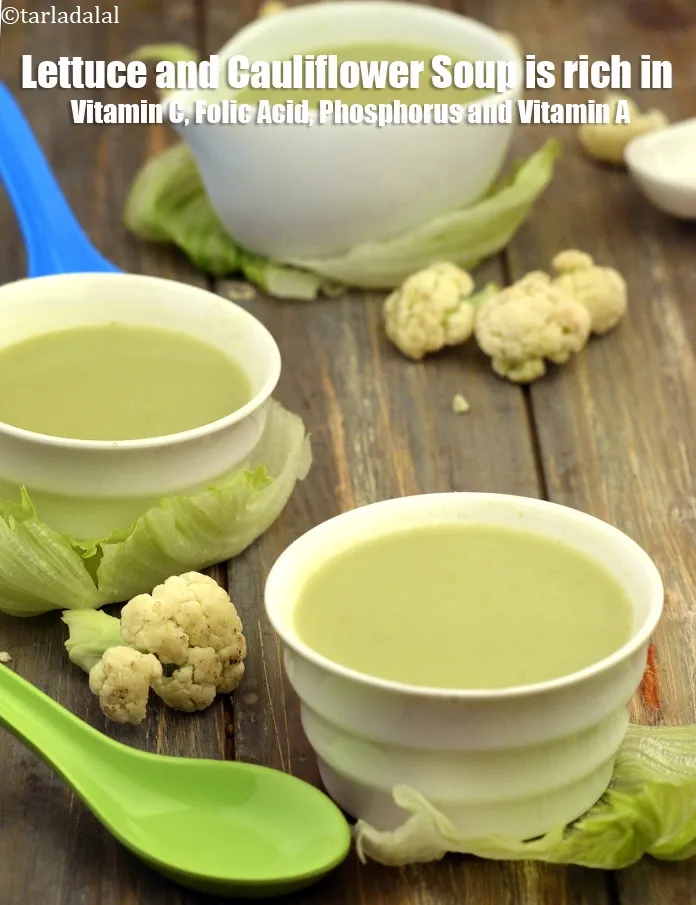 फूलगोभी के प्रयोग से इसमें दूध का प्रयोग भी नहीं करना पड़ता है! कटे हुए प्याज़ और कालीमिर्च इस लौह भरपुर और संपूर्ण लैट्यूस एण्ड कॉलीफ्लॉवर सूप को स्वाद और खुशबु प्रदान करते हैं।