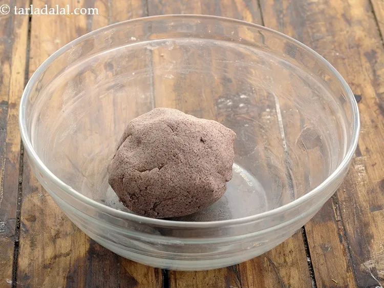 - टे के प्रत्येक भाग को थोड़े सूखे रागी का आटे का प्रयोग कर, 125 मिमी. (5”) व्यास के गोल आकार में बेल लें।