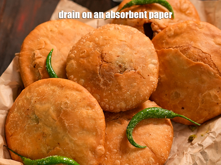 - Repeat steps 6 and 8 to deep-fry 4 more kachoris in one more batch.