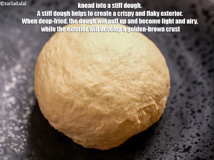 Knead into a stiff dough. A stiff dough helps to create a crispy and flaky exterior. When deep-fried, the dough will puff up and become light and airy, while the exterior will develop a golden-brown crust.