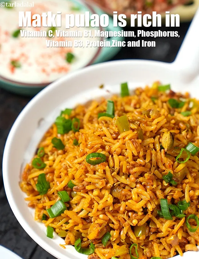 healthy matki pulao has other benefits too! Matki sprouts abound in fibre and thus form an ideal choice for weight watchers, diabetes, heart disease etc. The process of sprouting increases the protein count of matki by 30%.