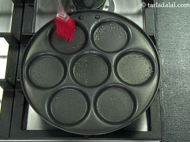 - To make mini cheese uttapa, heat a mini uttapa pan and grease it using a oil.