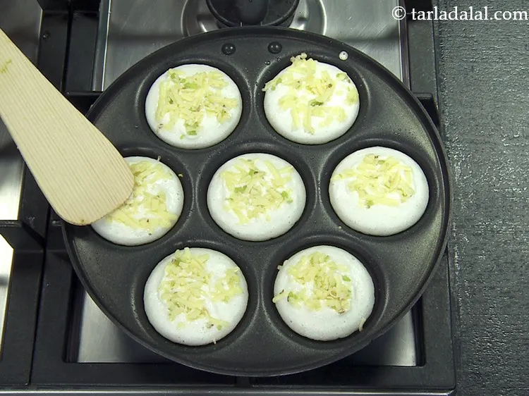 To prepare mini cheese uttapam at home, heat a mini uttapa pan and grease it using oil. Alternatively you can even make use of ghee or butter to make cheese uttapa more flavorful.