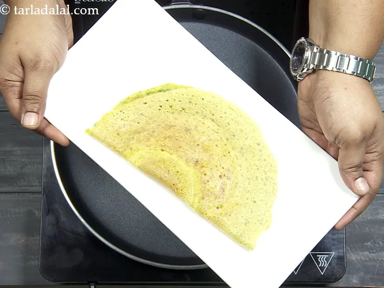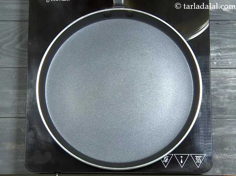 - Heat a non-stick tava (griddle). Pour a ladleful of the batter on it and spread it evenly to make a thin circle of 175 mm. (7") diameter.