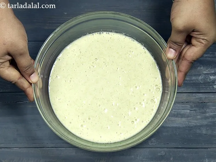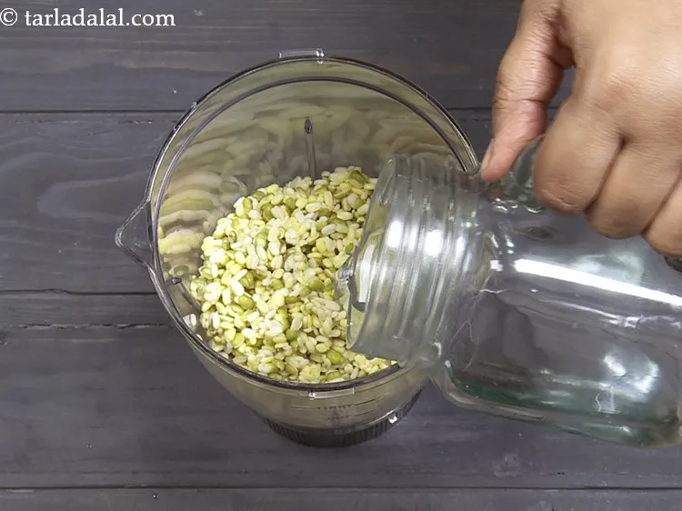 - Combine the soaked and drained dals along with ¾ cup of water in a mixer and blend till smooth.