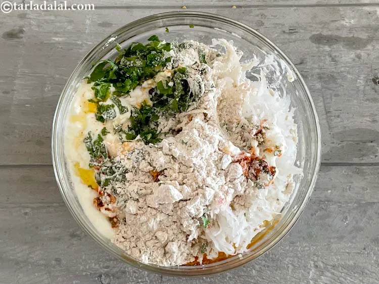 1. To make mooli thepla, combine all the ingredients into a deep bowl and knead into a soft dough without using any water.