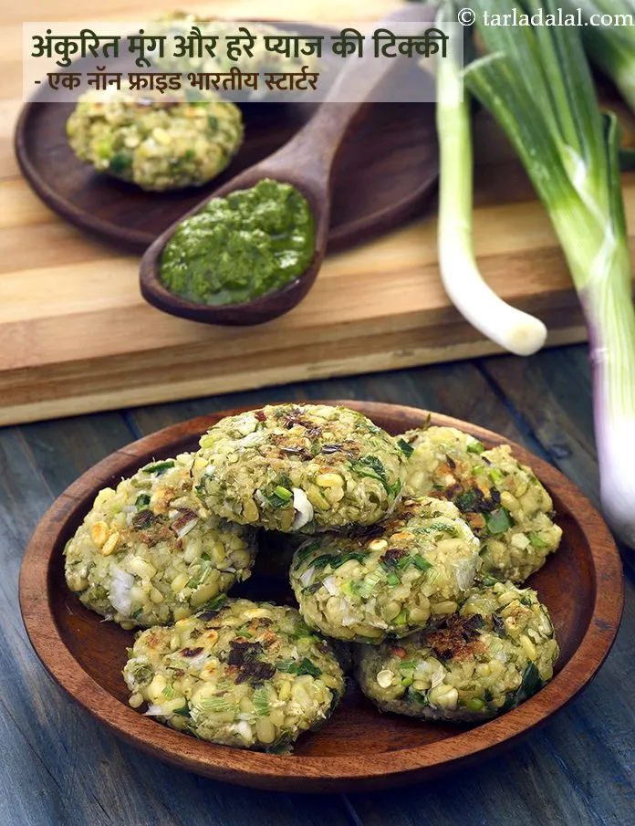 अंकुरित मूंग और हरे प्याज की टिक्की रेसिपी | मधुमेह के लिए अंकुरित मूंग कटलेट | स्वस्थ मूंग की टिक्क