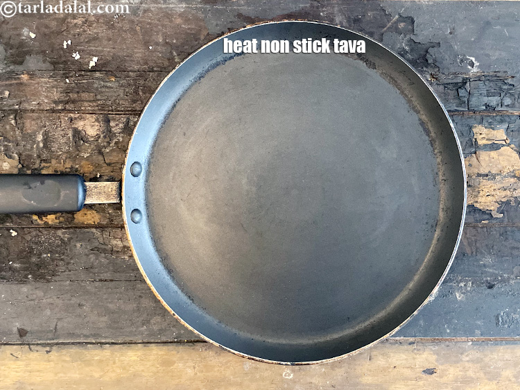 एक नॉन-स्टिक तवा गरम करें और उसे घी से चुपड़ लें।