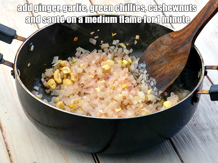 - Add the ginger, garlic, green chillies and cashewnuts and sauté on a medium flame for 1 minute. Remove and keep aside to cool slightly.
