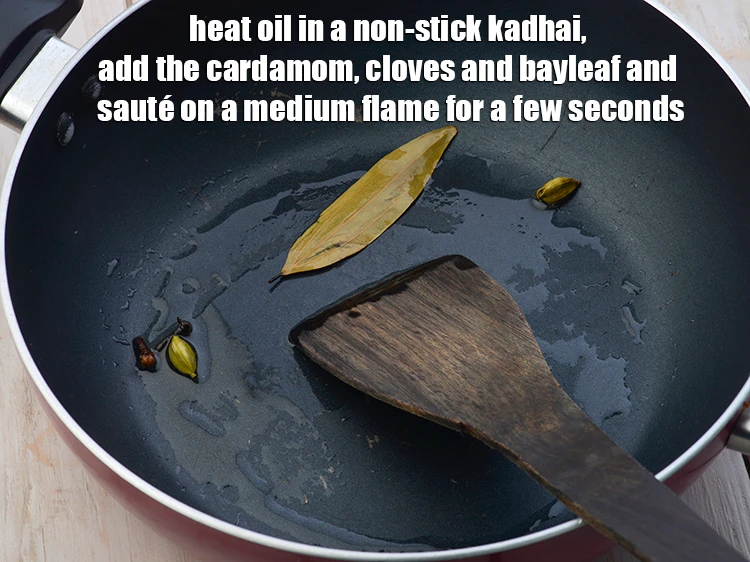 - Heat the oil in a non-stick kadhai, add the cardamom, cloves and bayleaf and sauté on a medium flame for a few seconds.