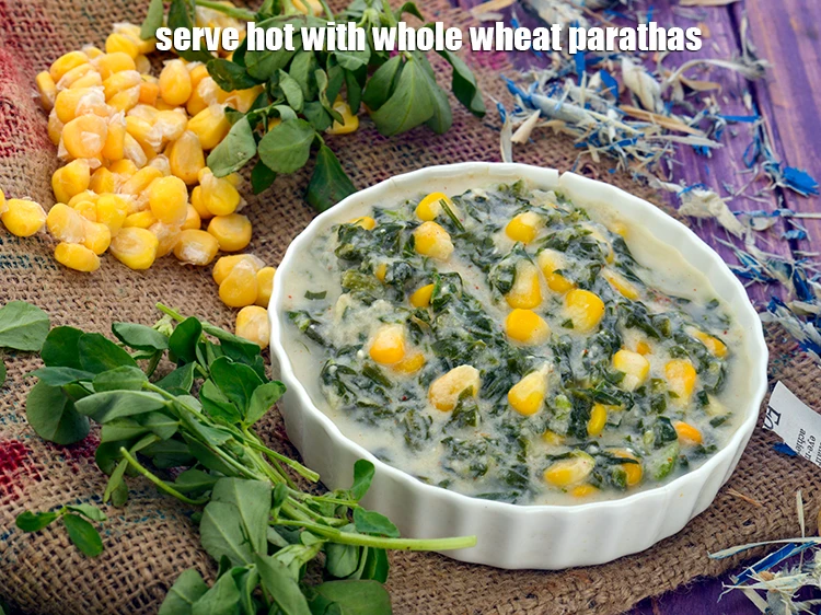 palak methi and corn sabzi is made from simple ingredients like palak, methi, sweet corn kernels, white gravy and Indian spices.