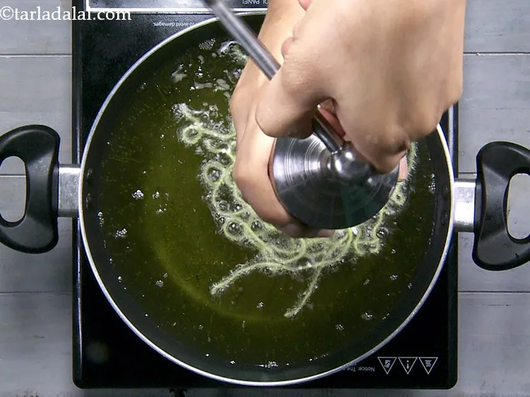 Deep-fry on a slow flame till it turns very light brown in colour from the bottom.