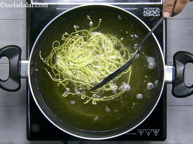 Flip and fry multiple times till the palak pudina sev is evenly cooked from all the sides. Do not cook once the bubbling sound stops, as it will just make the sev bitter on over frying.