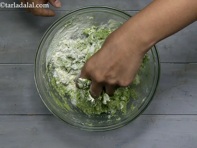 - To make palak pudina sev, combine all the ingredients, including the prepared paste in a deep bowl and knead into a soft dough.