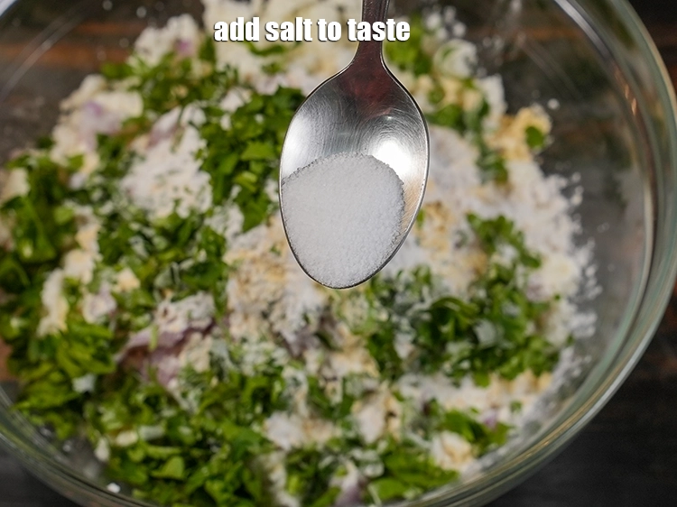 Then add 1/4 cup finely chopped onion to it. They give a nice bite to the paneer cheese balls on frying.