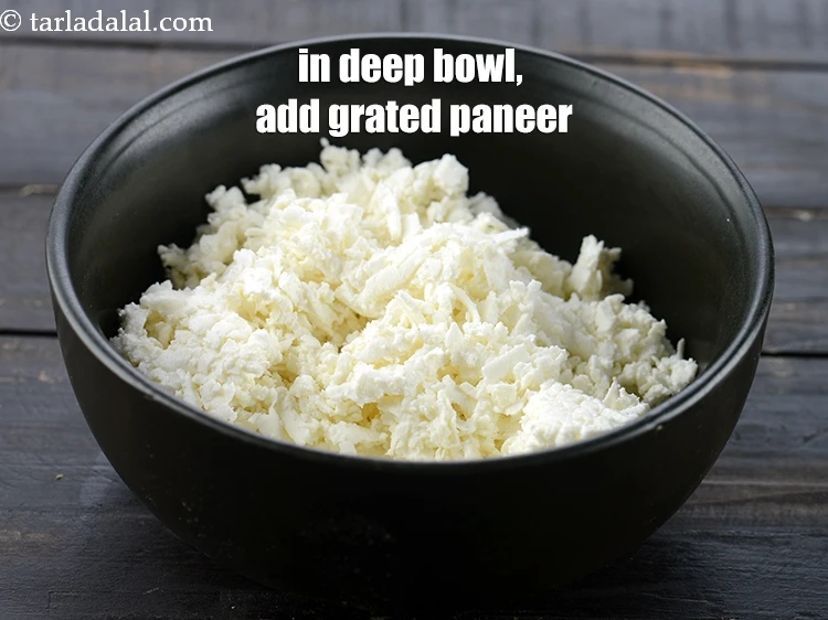 पनीर और शिमला मिर्च हॉट डॉग रोल रेसिपी | भारतीय पनीर चिली हॉट डॉग | चीज़ी पनीर हॉट डॉग | बनाने के लिए एक गहरे कटोरे में, 1 कप कसा हुआ पनीर (grated paneer) लें।