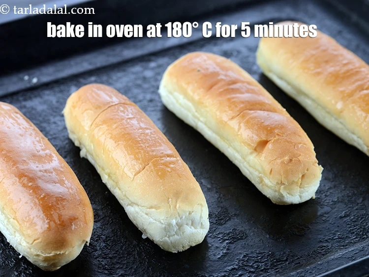 - प्रत्येक हॉट डॉग रोल के अंदर के भाग में थोड़ा पिघला हुआ मक्ख़न लगाऐं और पहले से गरम अवन में 180°c(360°f) के तापमान पर 5 मिनट के लिए बेक कर लें।