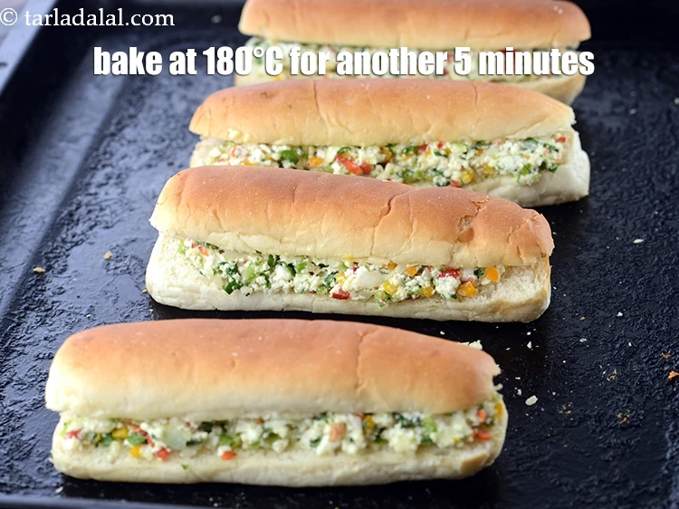 - प्रत्येक हॉट डॉग रोल में भरवां मिश्रण के एक भाग को भरे और दुबारा पहले से गरम अवन में 180°c(360°f) के तापमान पर और 5 मिनट के लिए बेक कर लें।