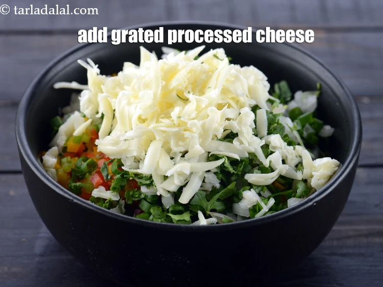 1/4 कप कसा हुआ प्रोसेस्ड चीज़ (grated processed cheese) डालें।