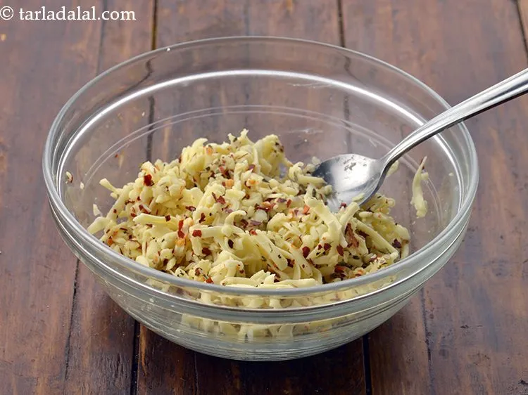 - To make pizza with mushrooms, garlic and walnuts, combine the cheese, mixed herbs and chilli flakes in a deep bowl, mix well and keep aside.