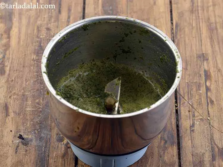 - To make pudina chaas, combine the mint leaves and 2 tbsp of water in a mixer and blend to a coarse paste.