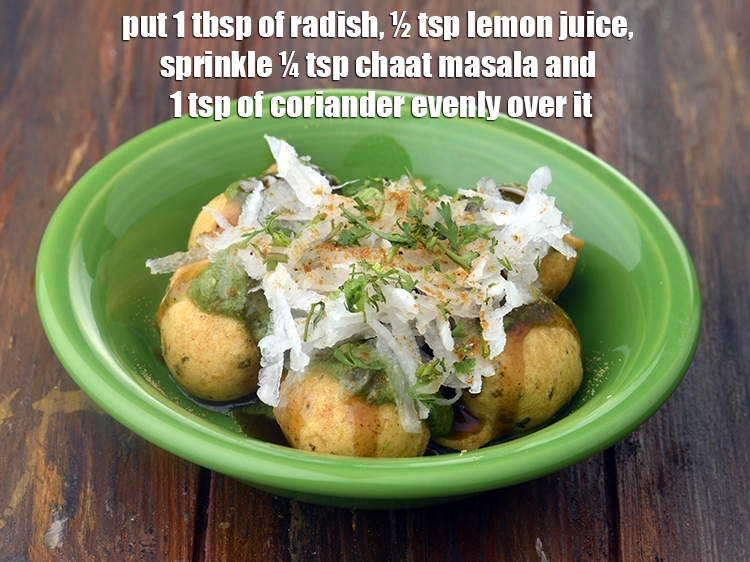 6. Put 1 tbsp of radish, ½ tsp lemon juice, sprinkle ¼ tsp chaat masala and 1 tsp of coriander evenly over it.