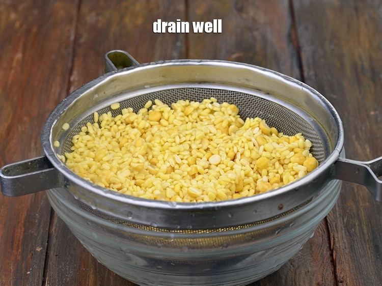 1. Combine the yellow moong dal and chana dal in a deep bowl and soak it in enough water for 4 hours. Drain well.