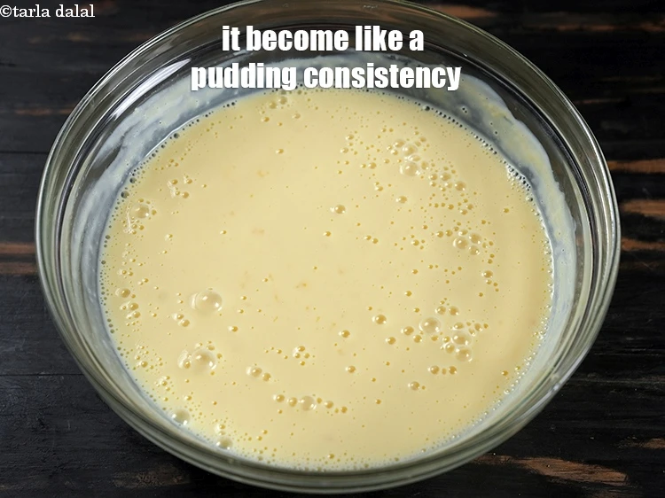 - Combine the cold milk, custard powder and sugar in a deep non-stick pan, mix well and cook on a medium flame for 8 to 10 minutes, while stirring continuously using a whisk.