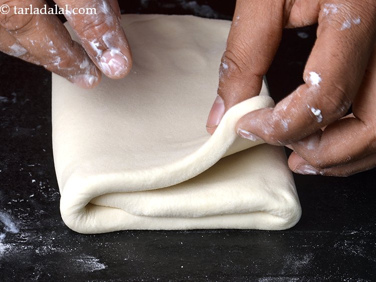 - Dust the flat surface with a little plain flour. Place the dough on it and roll it using a thick rolling pin into a 250 mm. (10”) × 150 mm. (6”) rectangle.
