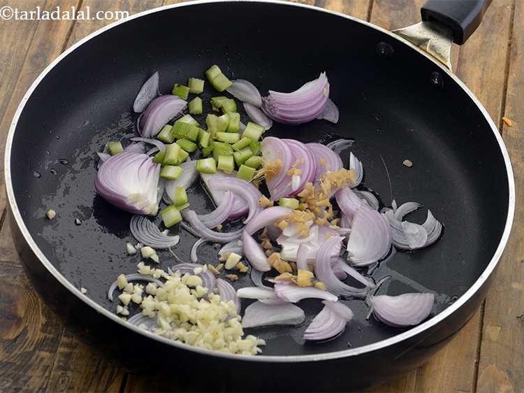 2. Heat the sesame oil in a broad non-stick pan, add the onions, ginger, garlic and celery and sauté on a medium flame for 1 minute.