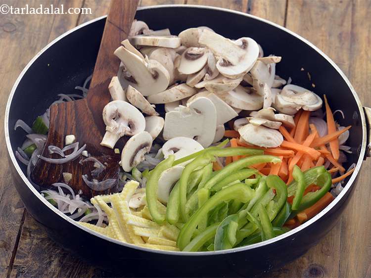 3. Add the carrot, babycorn, mushrooms, capsicum, purple cabbage, bean sprouts and salt and sauté on a high flame for 2 to 3 minutes.