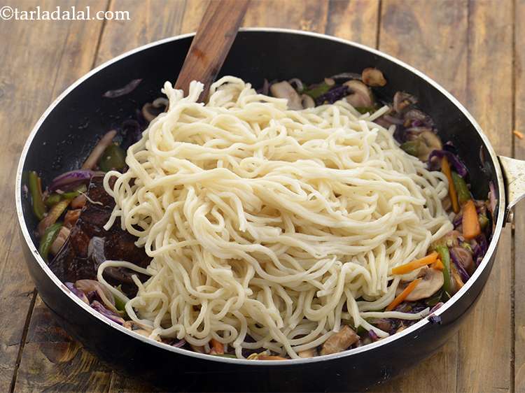 21. Give it a gentle toss and cook on medium flame for 4 to 5 minutes, while stirring continuously. Make use of two wooden spoons or a noodle tong to mix the noodles.