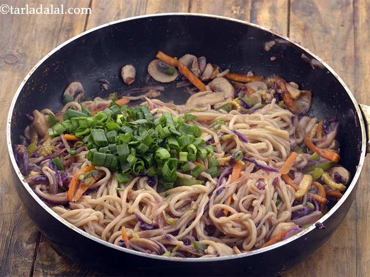 22. Turn the flame off, add the spring onions to vegetable chow mein | Chinese veg chow mein | Indian style vegetable chowmein |