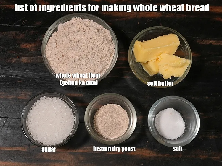 What is whole wheat bread made of? See the below image of list of ingredients for making whole wheat bread.