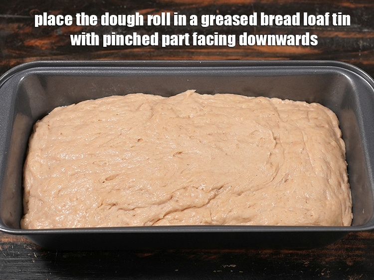 Place the dough roll in a greased bread loaf tin with pinched part facing downwards.