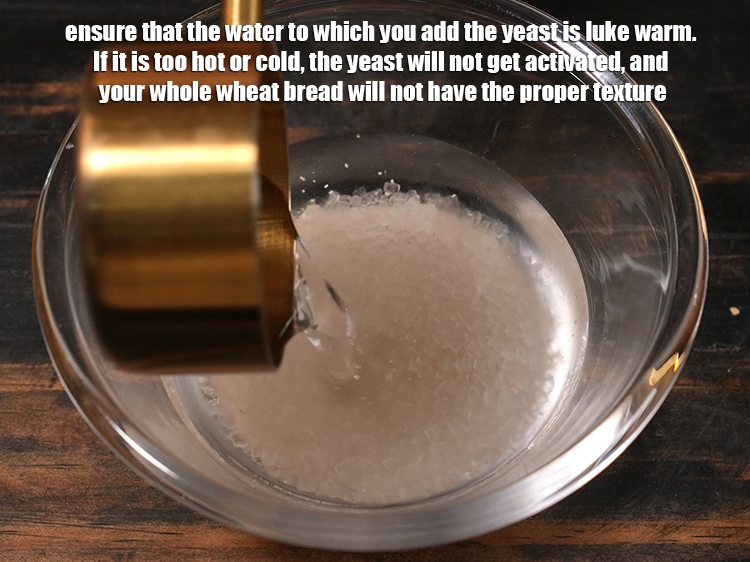 Ensure that the water to which you add the yeast is luke warm. If it is too hot or cold, the yeast will not get activated, and your whole wheat bread will not have the proper texture.