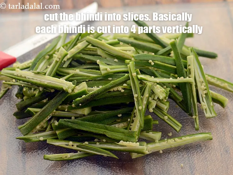 Cut the bhindi into slices. Basically each bhindi is cut into 4 parts vertically.