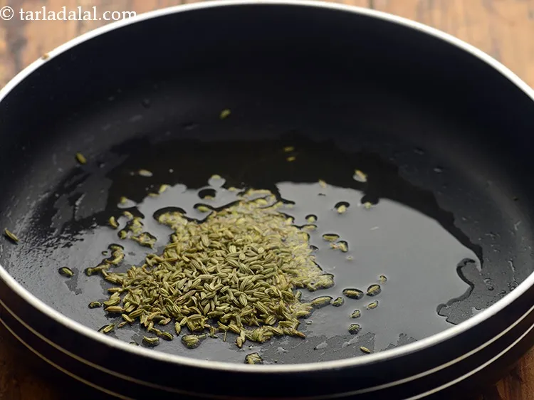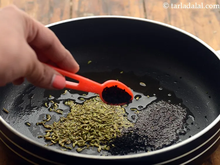 - Heat the remaining 1 tbsp of oil in the same broad non-stick pan, add the fennel seeds, mustard seeds, nigella seeds, fenugreek seeds and asafoetida and sauté on a medium flame for a few seconds.
