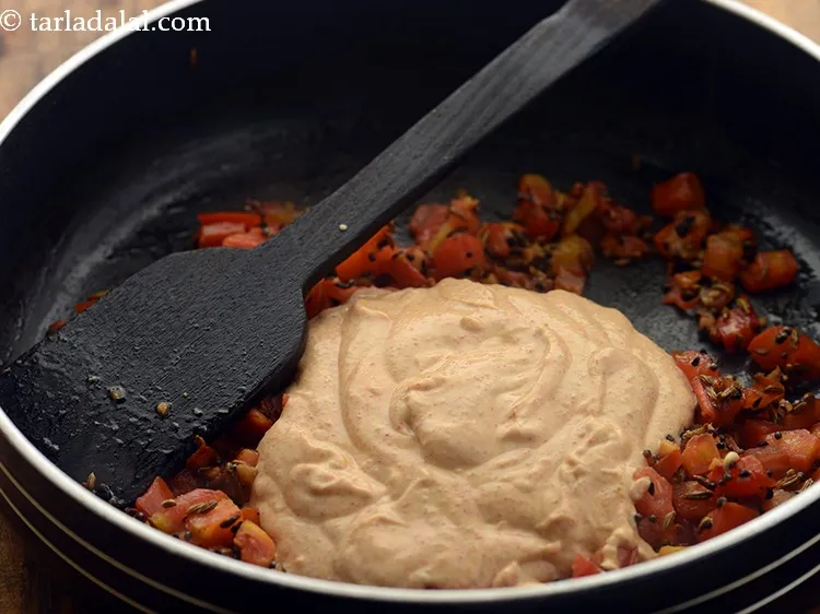 - Lower the flame, add the curd mixture, mix well and cook for 1 minute, while stirring continuously.