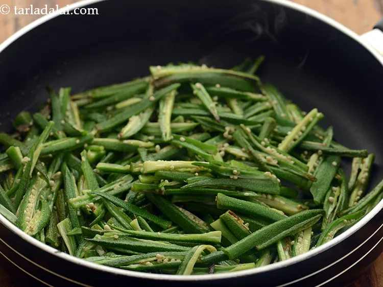 - Add the shallow-fried ladies finger and salt, mix well and cook on a medium flame for 1 to 2 minutes, while stirring occasionally.