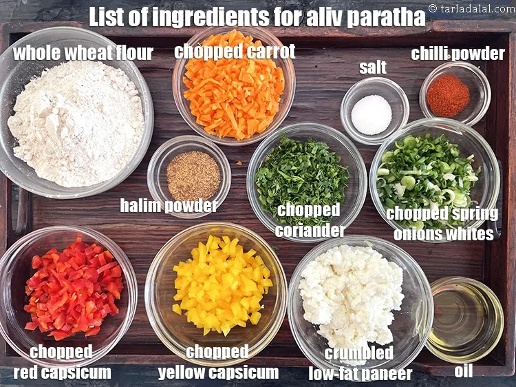 what is aliv paratha made off? halim vegetable paratha is made from cheap and easily available ingredients in India such as a dough of whole wheat flour and aliv ( garden cress, halim ) and stuffing off 1/2 cup finely chopped red capsicum, 1/2 cup finely chopped yellow capsicum, 1/2 cup finely chopped carrot, 1/2 cup finely chopped spring onions whites, 1/4 cup finely chopped coriander (dhania), 1/2 cup crumbled low-fat paneer (cottage cheese), 1 tsp chilli powder and salt to taste. See below image of list of ingredients for aliv paratha.