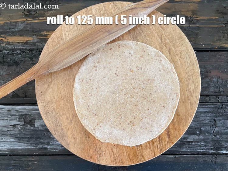 - Roll a portion of the dough into a 125 mm. (5”) diameter thin circle using wheat flour for rolling.