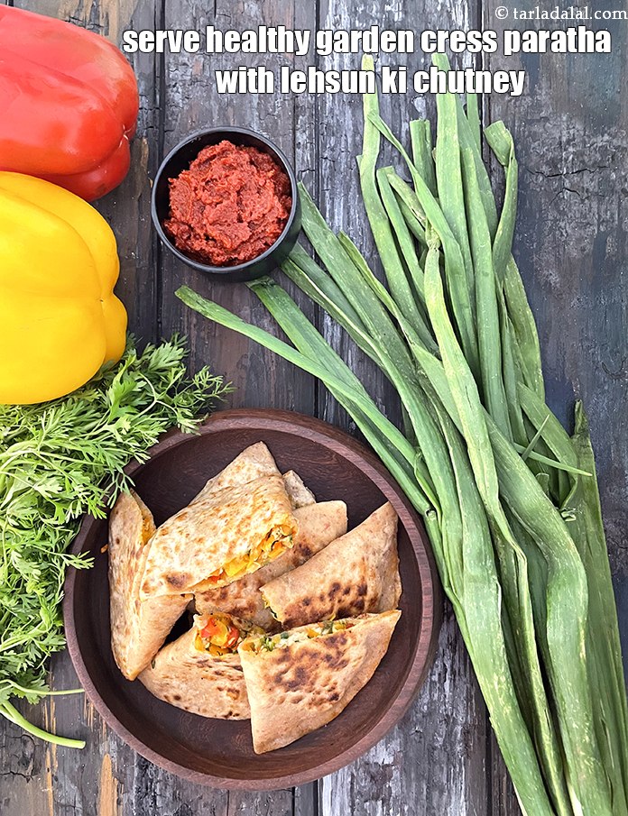 Serve healthy garden cress paratha with lahsun ki chutney or healthy green chutney for an iron rich meal.