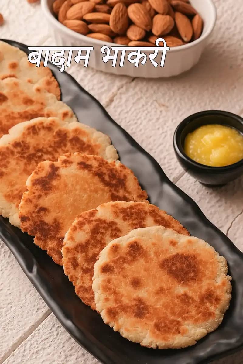 बादाम भाकरीबनाने के लिए बादाम को १ घंटे के लिए गर्म पानी में भिगोएँ, छील लें। बादाम को बिना पानी डाले चिकना होने तक पीस लें। इसमें 2 चम्मच पिघला हुआ घी, नमक डालें और अच्छी तरह मिलाएँ और बिना पानी डाले आटा गूंथ लें।