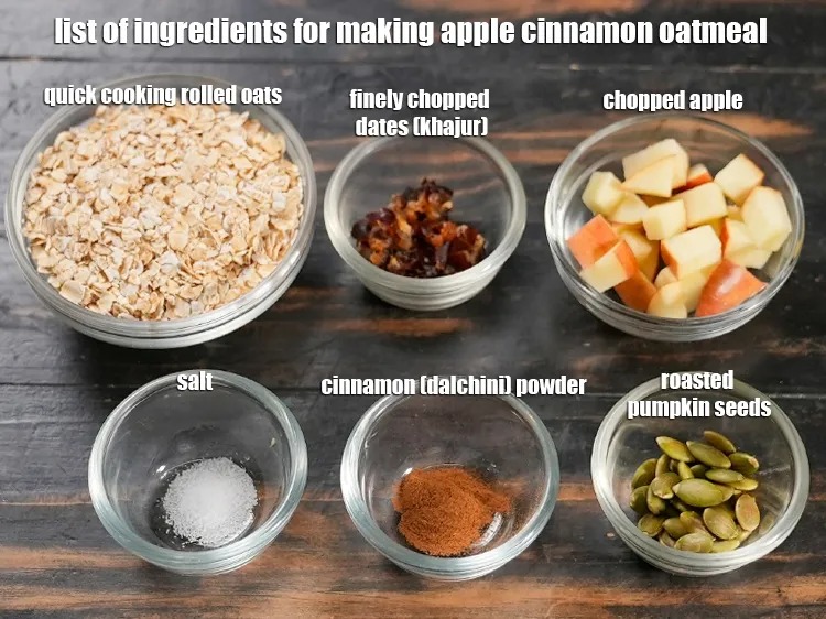 See the below image of list of ingredients for making apple cinnamon oatmeal.