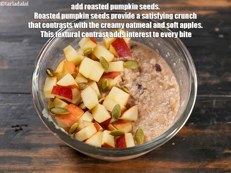 Add 1 tsp roasted pumpkin seeds. Roasted pumpkin seeds provide a satisfying crunch that contrasts with the creamy oatmeal and soft apples. This textural contrast adds interest to every bite. Pumpkin seeds are a good source of plant-based protein and are a good source of micronutrients like magnesium, zinc, and iron, contributing to overall well-being.