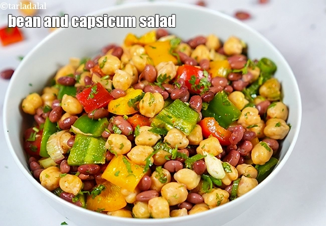 bean and capsicum salad recipe | rajma, kabuli chana salad | protein rich Indian rajma salad with bell peppers | One serving of bean and capsicum salad has 24% protein , 57% fiber. 188 % Vitamin C, 89% Folic Acid, 40% Vitamin B1, 27% Calcium , 42% Iron, 41% Phosphorus, 38% Magnesium, 18% Potassium, 24% Zince of your Recommended Dietary Allowance ( RDA).