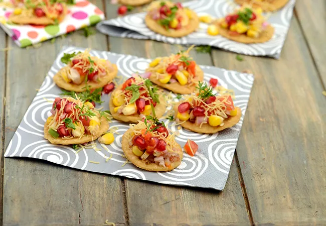 4. Looking for a gluten-free chaat? These Corn Sev Puris topped with tomato chutney and sev is a great evening snack.