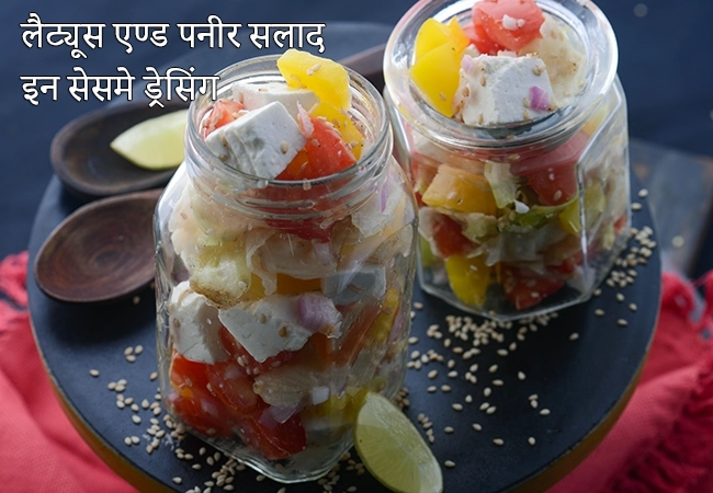 लैट्यूस एण्ड पनीर सलाद इन सेसमे ड्रेसिंग | हेल्दी लैट्यूस के साथ पनीर सलाद | कॅल्शियम युक्त लैट्यूस पनीर सलाद | lettuce and paneer salad in sesame dressing recipe in hindi language |